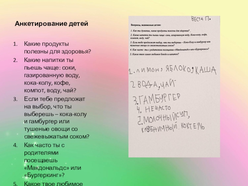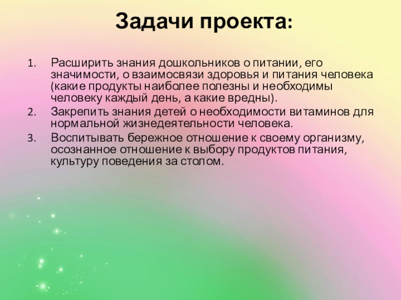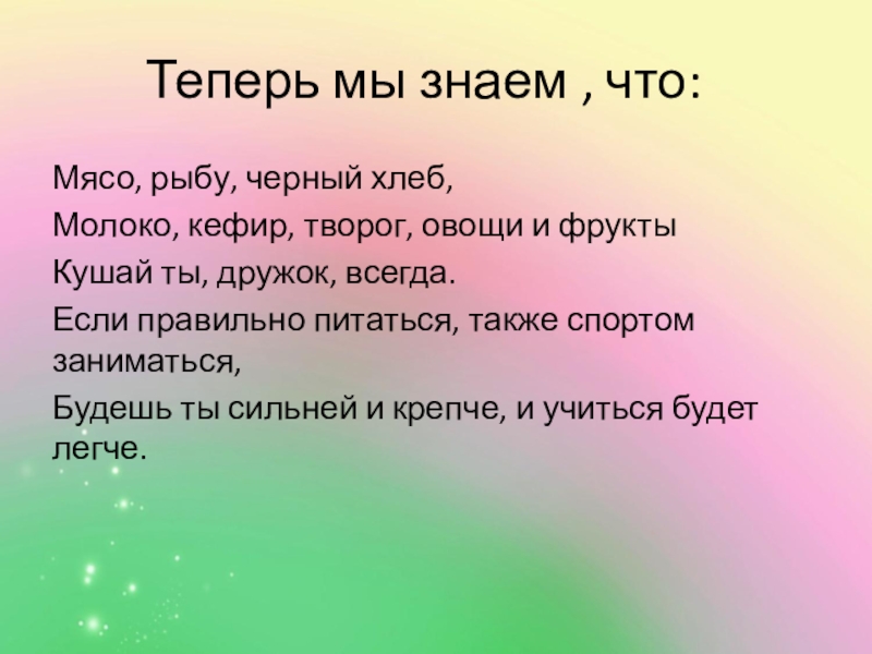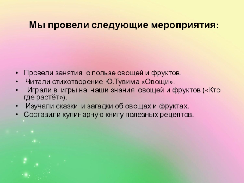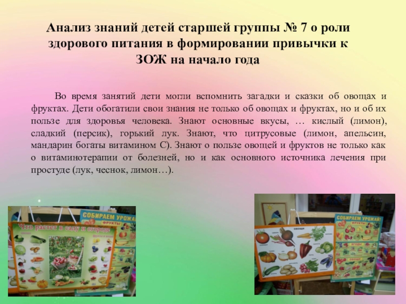 Во время занятий дети могли вспомнить загадки и сказки об овощах и фруктах. Дети обогатили свои знания не только об овощах и фруктах, но и об их пользе для здоровья человека. Знают основные вкусы, … кислый (лимон), сладкий (персик), горький лук. Знают, что цитрусовые (лимон, апельсин, мандарин богаты витамином С). Знают о пользе овощей и фруктов не только как о витаминотерапии от болезней, но и как основного источника лечения при простуде (лук, чеснок, лимон…).