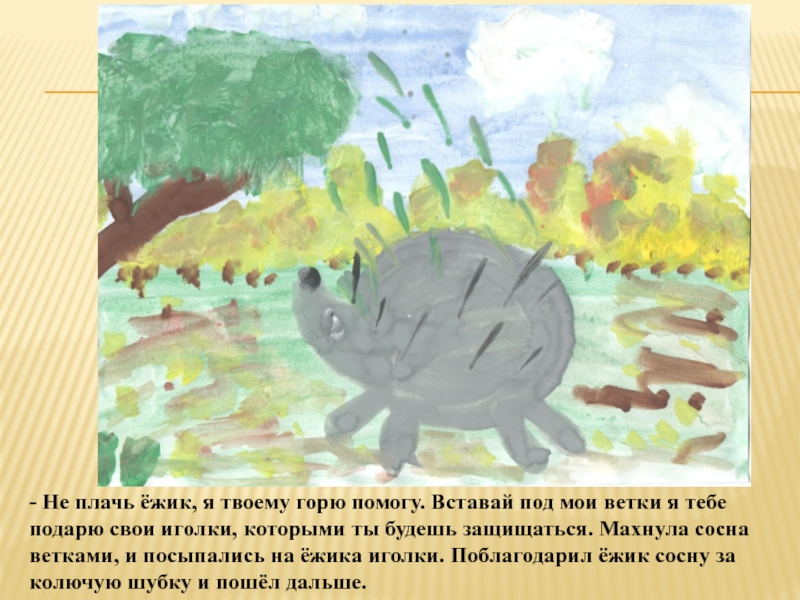Слайд 6Увидела его старая, могучая сосна и спрашивает: - Что ты, ёжик,