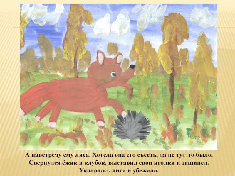 Слайд 8А навстречу ему лиса. Хотела она его съесть, да не тут-то