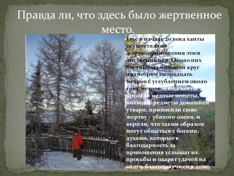 Правда ли, что здесь было жертвенное место. Ещё в начале 20 века ханты осуществляли жертвоприношения этим лиственницам.