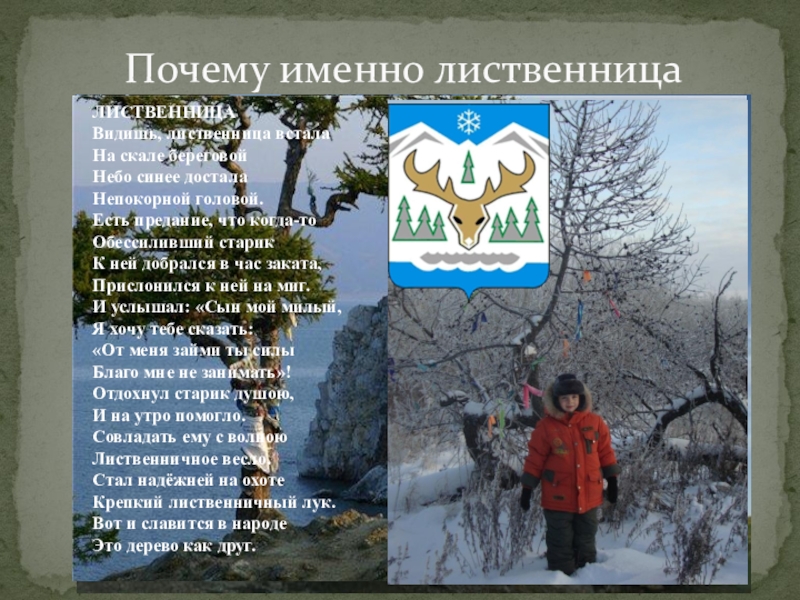 Почему именно лиственницаЛИСТВЕННИЦАВидишь, лиственница встала На скале береговой Небо синее достала Непокорной головой. Есть предание, что когда-то