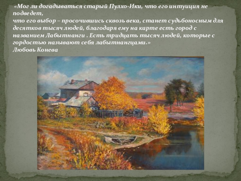 что его выбор – просочившись сквозь века, станет судьбоносным для десятков тысяч людей, благодаря ему на карте есть город с названием Лабытнанги . Есть тридцать тысяч людей, которые с гордостью называют себя лабытнангцами.» Любовь Конева