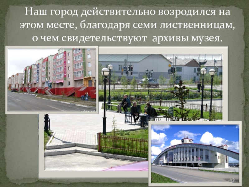 Слайд 6Наш город действительно возродился на этом месте, благодаря семи лиственницам, о