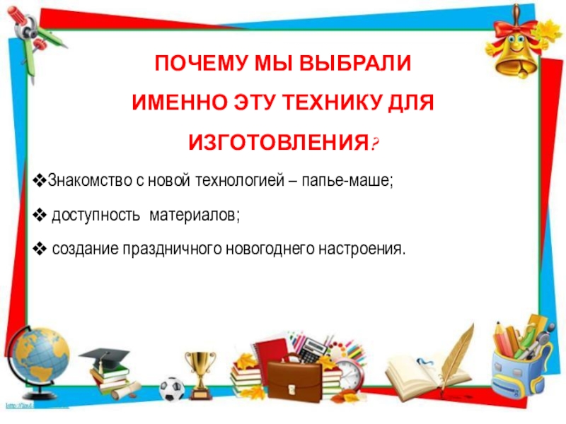 ПОЧЕМУ МЫ ВЫБРАЛИ ИМЕННО ЭТУ ТЕХНИКУ ДЛЯ ИЗГОТОВЛЕНИЯ?Знакомство с новой технологией – папье-маше; доступность материалов; создание праздничного