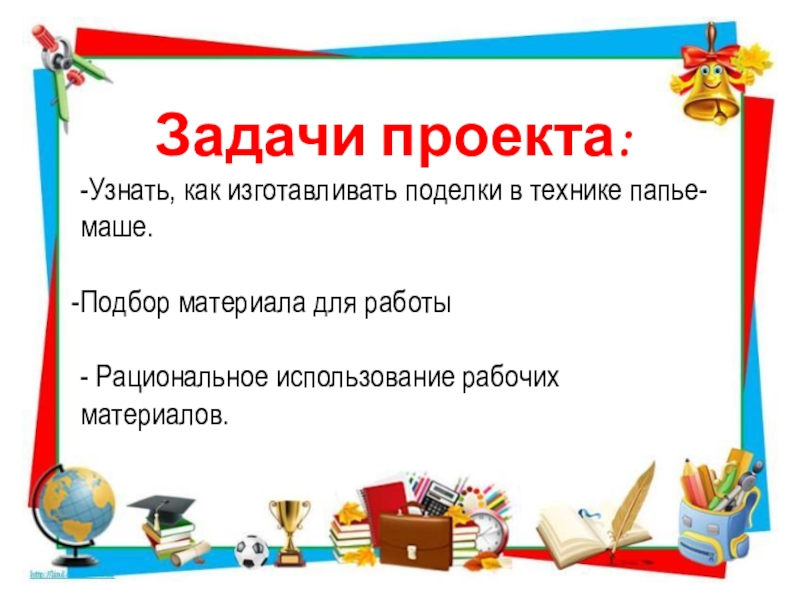Задачи проекта:-Узнать, как изготавливать поделки в технике папье-маше. Подбор материала для работы - Рациональное использование рабочих
