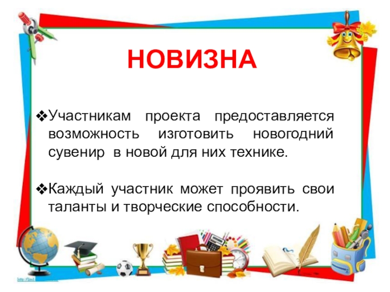 НОВИЗНАУчастникам проекта предоставляется возможность изготовить новогодний сувенир в новой для них технике.Каждый участник может проявить свои таланты