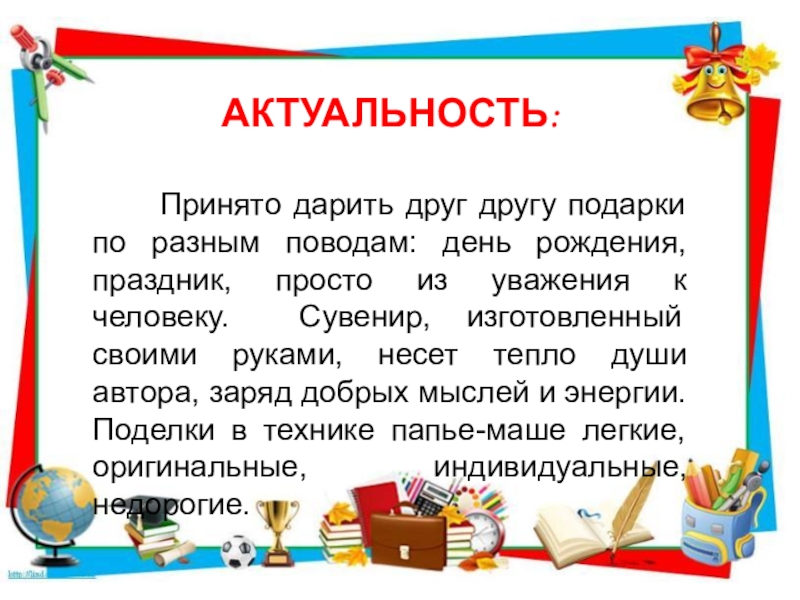 разным поводам: день рождения, праздник, просто из уважения к человеку. Сувенир, изготовленный своими руками, несет тепло души автора, заряд добрых мыслей и энергии. Поделки в технике папье-маше легкие, оригинальные, индивидуальные, недорогие.