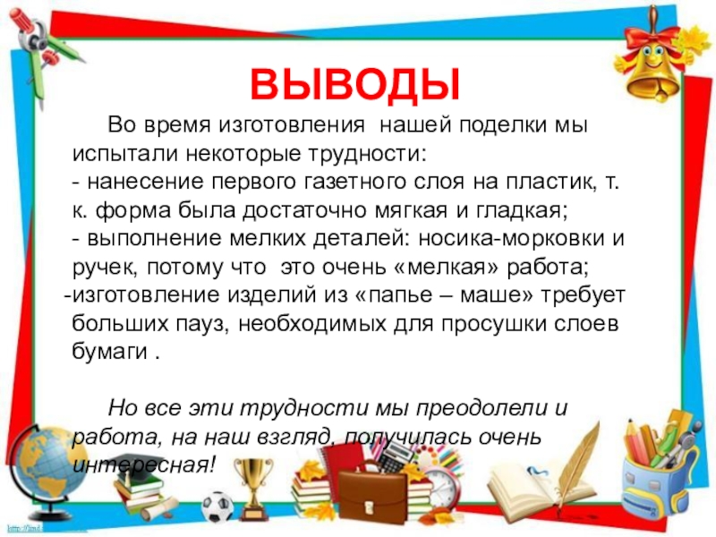 ВЫВОДЫВо время изготовления нашей поделки мы испытали некоторые трудности:- нанесение первого газетного слоя на пластик, т. к.