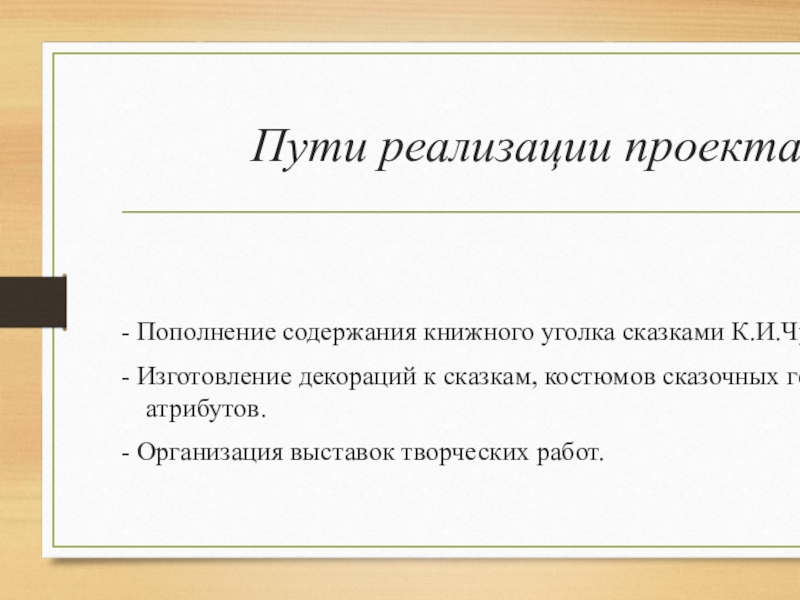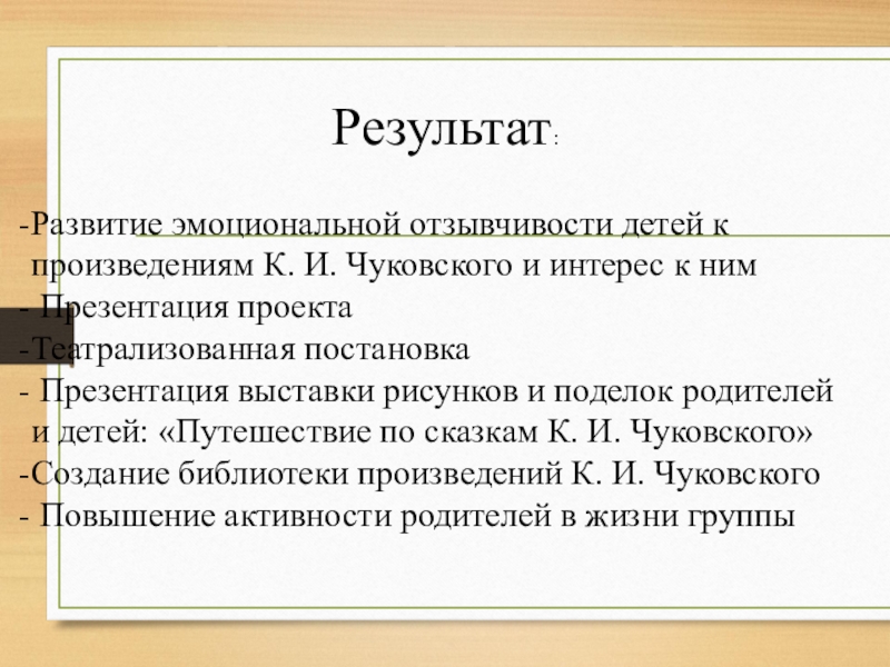 - Создать условия в группе для поддержания интереса детей к творчеству К.И.Чуковского (оборудование книжного уголка, театральной зоны с костюмами героев сказок К.Чуковского)