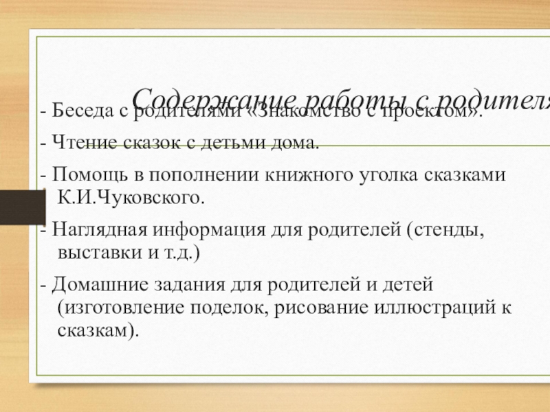 - Домашние задания для родителей и детей (изготовление поделок, рисование иллюстраций к сказкам).