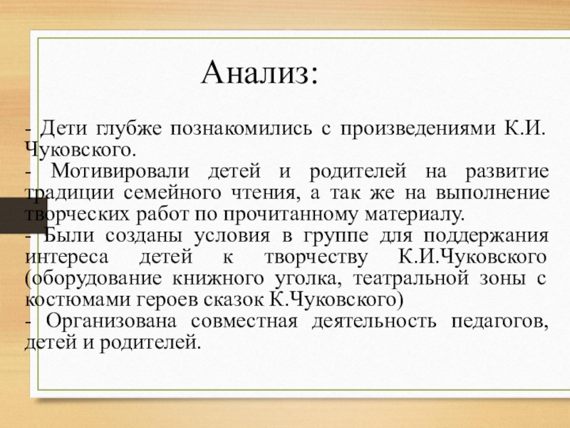 - Были созданы условия в группе для поддержания интереса детей к творчеству К.И.Чуковского (оборудование книжного уголка, театральной зоны с костюмами героев сказок К.Чуковского)