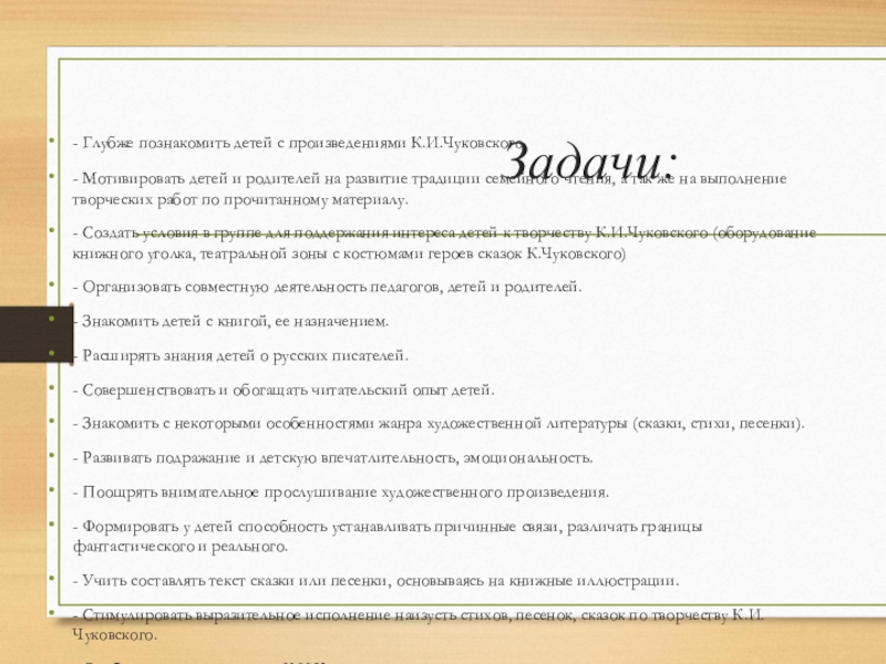 - Глубже познакомить детей с произведениями К.И.Чуковского.