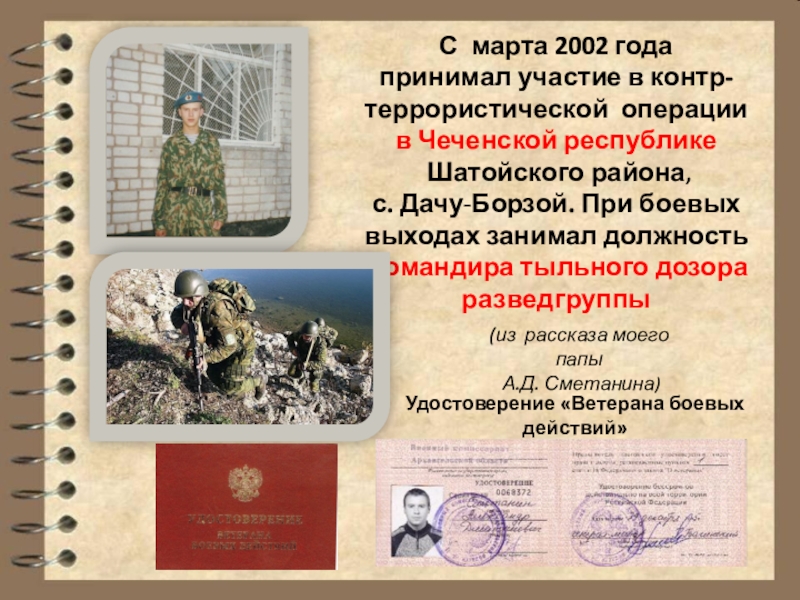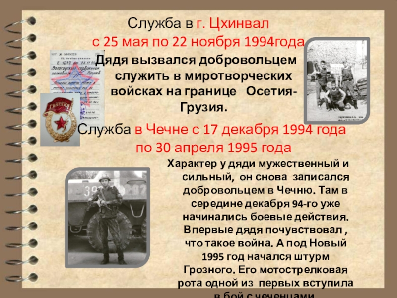 Характер у дяди мужественный и сильный, он снова записался добровольцем в Чечню. Там в середине декабря 94-го уже начинались боевые действия. Впервые дядя почувствовал , что такое война. А под Новый 1995 год начался штурм Грозного. Его мотострелковая рота одной из первых вступила в бой с чеченцами.