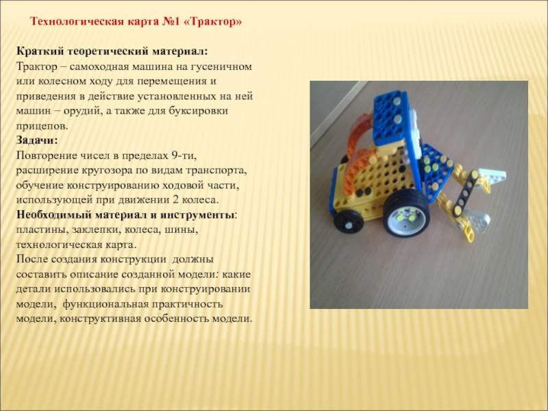 Научился решать технические задачи в процессе конструирования: как соединять и прикрепить детали, что приводит к движению колёс.