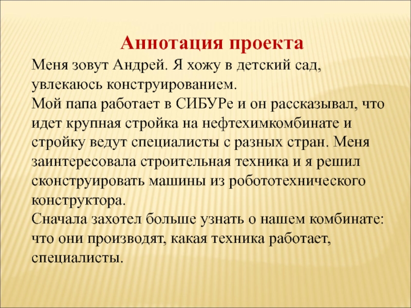 Меня зовут Андрей. Я хожу в детский сад, увлекаюсь конструированием.