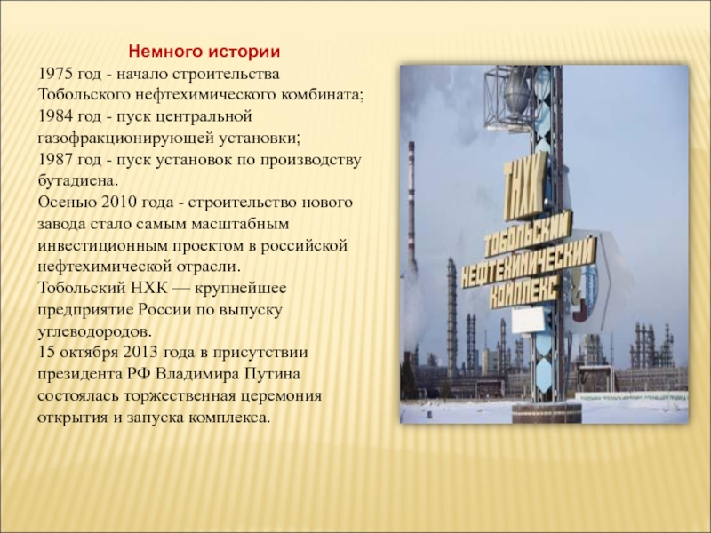 1975 год - начало строительства Тобольского нефтехимического комбината;
