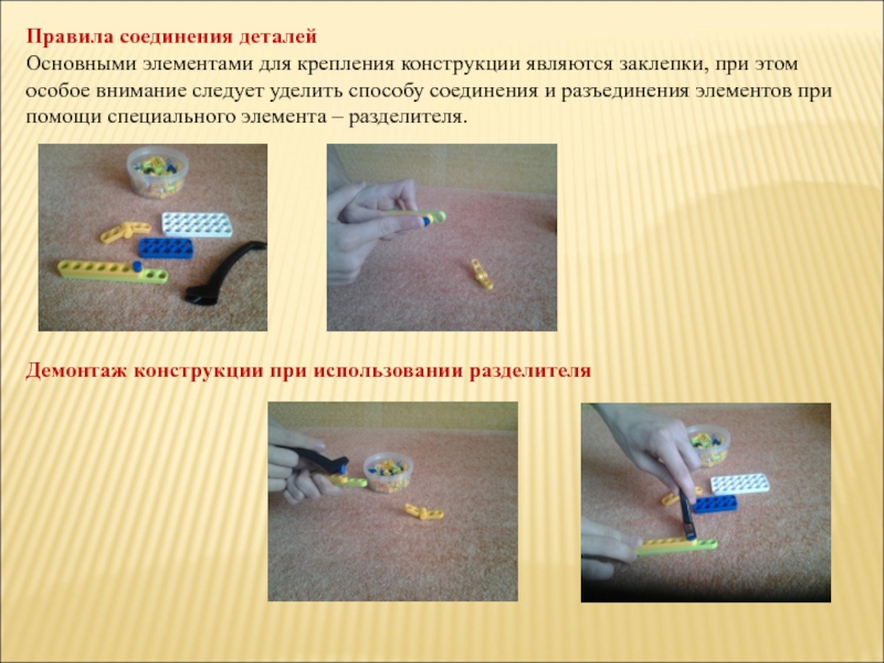 особое внимание следует уделить способу соединения и разъединения элементов при помощи специального элемента – разделителя.
