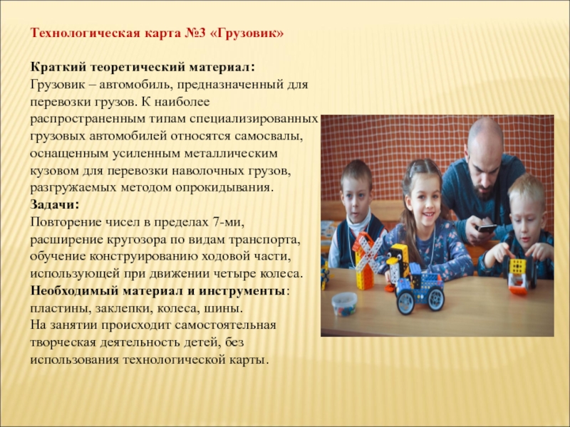 Повторение чисел в пределах 7-ми, расширение кругозора по видам транспорта, обучение конструированию ходовой части, использующей при движении четыре колеса.