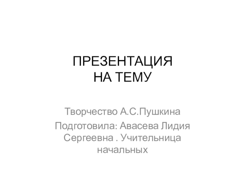 ПРЕЗЕНТАЦИЯ  НА ТЕМУ  Творчество А.С.ПушкинаПодготовила: Авасева Лидия Сергеевна . Учительница начальных