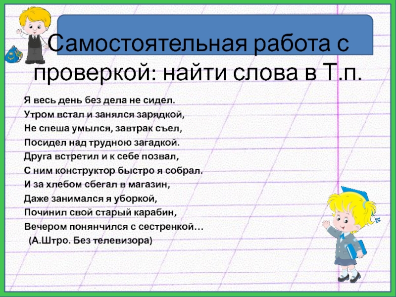 Слайд 8Самостоятельная работа с проверкой: найти слова в Т.п.