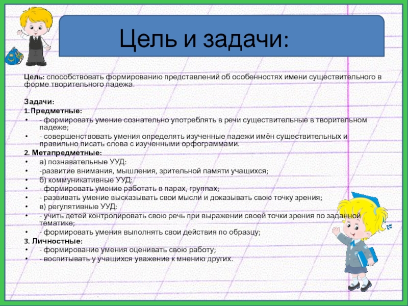 - совершенствовать умения определять изученные падежи имён существительных и правильно писать слова с изученными орфограммами.