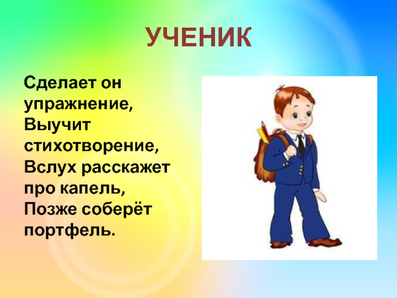 УЧЕНИКСделает он упражнение, Выучит стихотворение, Вслух расскажет про капель, Позже соберёт портфель.