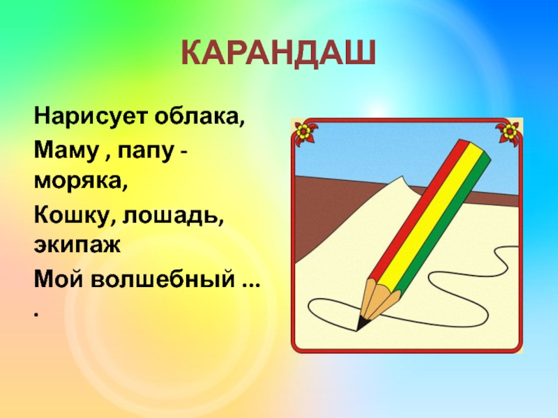 КАРАНДАШНарисует облака,Маму , папу - моряка,Кошку, лошадь, экипажМой волшебный ... .