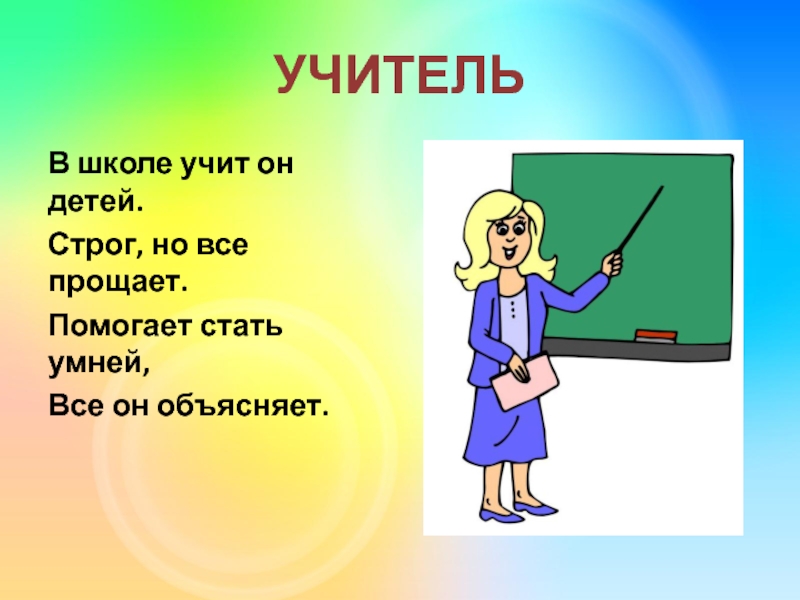 УЧИТЕЛЬВ школе учит он детей.Строг, но все прощает.Помогает стать умней,Все он объясняет.