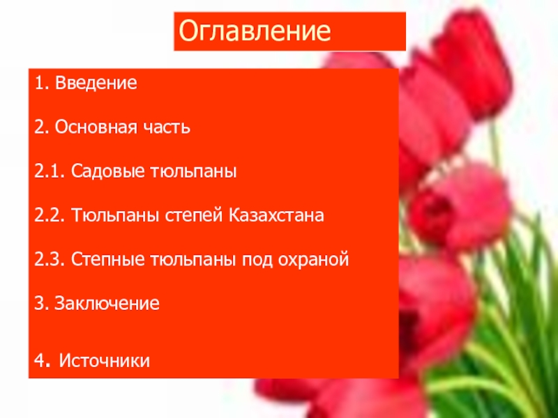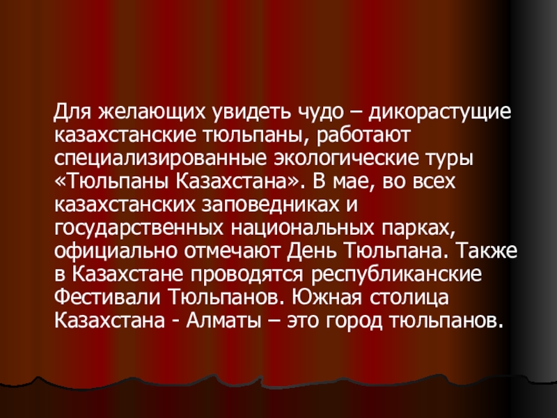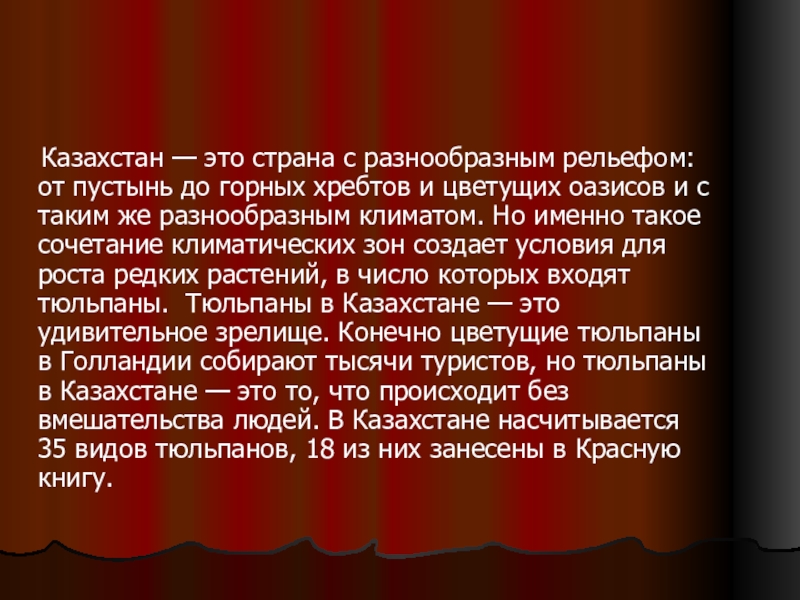 до горных хребтов и цветущих оазисов и с таким же разнообразным климатом. Но именно такое сочетание климатических зон создает условия для роста редких растений, в число которых входят тюльпаны. Тюльпаны в Казахстане — это удивительное зрелище. Конечно цветущие тюльпаны в Голландии собирают тысячи туристов, но тюльпаны в Казахстане — это то, что происходит без вмешательства людей. В Казахстане насчитывается 35 видов тюльпанов, 18 из них занесены в Красную книгу.