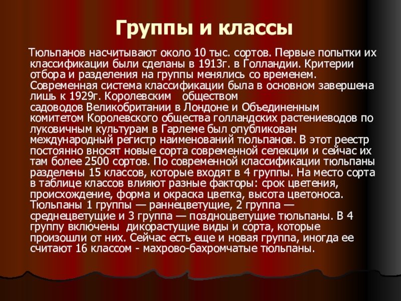 попытки их классификации были сделаны в 1913г. в Голландии. Критерии отбора и разделения на группы менялись со временем. Современная система классификации была в основном завершена лишь к 1929г. Королевским обществом садоводов Великобритании в Лондоне и Объединенным комитетом Королевского общества голландских растениеводов по луковичным культурам в Гарлеме был опубликован международный регистр наименований тюльпанов. В этот реестр постоянно вносят новые сорта современной селекции и сейчас их там более 2500 сортов. По современной классификации тюльпаны разделены 15 классов, которые входят в 4 группы. На место сорта в таблице классов влияют разные факторы: срок цветения, происхождение, форма и окраска цветка, высота цветоноса. Тюльпаны 1 группы — раннецветущие, 2 группа — среднецветущие и 3 группа — поздноцветущие тюльпаны. В 4 группу включены дикорастущие виды и сорта, которые произошли от них. Сейчас есть еще и новая группа, иногда ее считают 16 классом - махрово-бахромчатые тюльпаны.