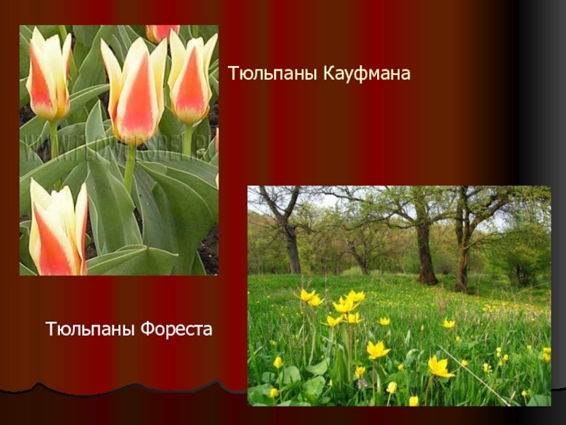 — тюльпаны Кауфмана. Растения этого класса отличаются самыми ранними сроками цветения (иногда уже в начале апреля) и небольшой высотой (15—25 см). Цветки у тюльпанов Кауфмана довольно крупные, удлиненные, а в полностью раскрытом состоянии — звездчатые. Окраска может быть самой разнообразной: красной, желтой, розовой, чаще бывает двухцветной. Используются тюльпаны Кауфмана, главным образом, для выращивания на альпийских горках, для высадки в бордюрах и под деревьями.