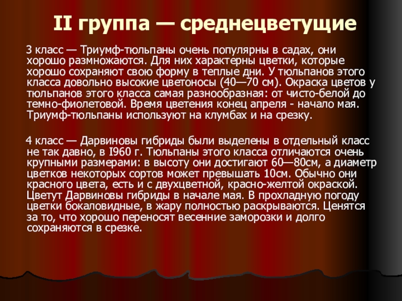 11 класс — Махровые поздние тюльпаны отличаются крупными размерами всего растения и поздним сроком цветения. Окраска тюльпанов этого