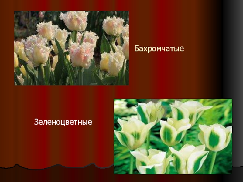 8 класс — Зеленоцветные тюльпаны не часто пока встречаются в наших садах, в отдельный класс выделены в 1981г. По признаку наличия зеленого цвета середины лепестков. Цветовой контраст зеленой середины и белых, желтых, розовых краев лепестков выглядит очень эффектно. Высота тюльпанов этого класса может быть разное, время цветения - середина мая. Выращивают для срезки и оформления цветников.
