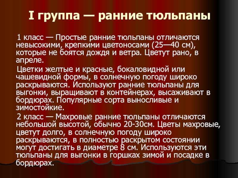 1 класс — Простые ранние тюльпаны отличаются невысокими, крепкими цветоносами (25—40 см), которые не боятся дождя и ветра. Цветут рано, в апреле.
