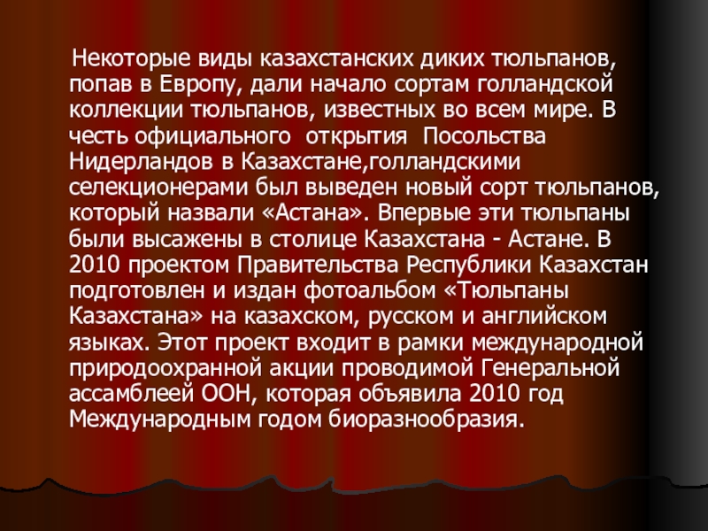 начало сортам голландской коллекции тюльпанов, известных во всем мире. В честь официального открытия Посольства Нидерландов в Казахстане,голландскими селекционерами был выведен новый сорт тюльпанов, который назвали «Астана». Впервые эти тюльпаны были высажены в столице Казахстана - Астане. В 2010 проектом Правительства Республики Казахстан подготовлен и издан фотоальбом «Тюльпаны Казахстана» на казахском, русском и английском языках. Этот проект входит в рамки международной природоохранной акции проводимой Генеральной ассамблеей ООН, которая объявила 2010 год Международным годом биоразнообразия.