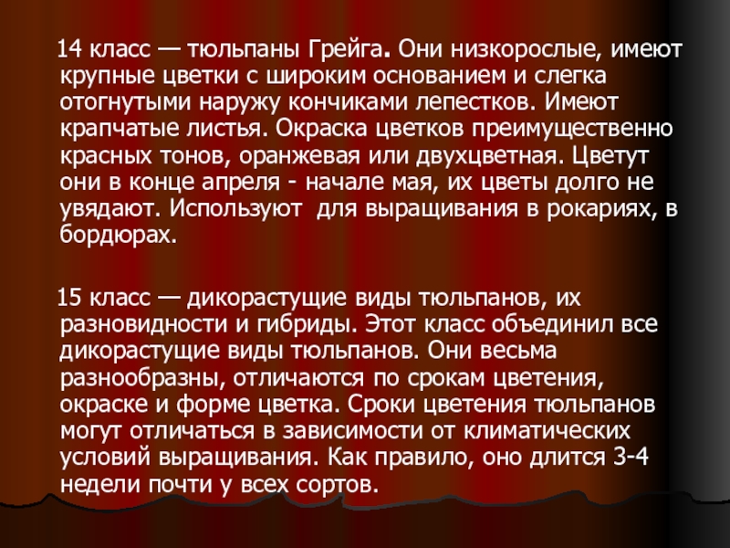 14 класс — тюльпаны Грейга. Они низкорослые, имеют крупные цветки