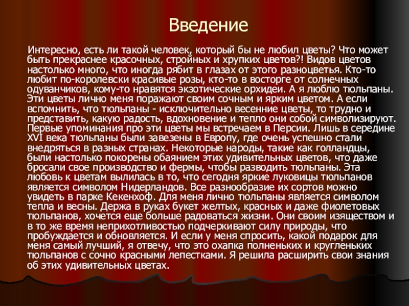 любил цветы? Что может быть прекраснее красочных, стройных и хрупких цветов?! Видов цветов настолько много, что иногда рябит в глазах от этого разноцветья. Кто-то любит по-королевски красивые розы, кто-то в восторге от солнечных одуванчиков, кому-то нравятся экзотические орхидеи. А я люблю тюльпаны. Эти цветы лично меня поражают своим сочным и ярким цветом. А если вспомнить, что тюльпаны - исключительно весенние цветы, то трудно и представить, какую радость, вдохновение и тепло они собой символизируют. Первые упоминания про эти цветы мы встречаем в Персии. Лишь в середине XVI века тюльпаны были завезены в Европу, где очень успешно стали внедряться в разных странах. Некоторые народы, такие как голландцы, были настолько покорены обаянием этих удивительных цветов, что даже бросали свое производство и фермы, чтобы разводить тюльпаны. Эта любовь к цветам вылилась в то, что сегодня яркие луковицы тюльпанов является символом Нидерландов. Все разнообразие их сортов можно увидеть в парке Кекенхоф. Для меня лично тюльпаны является символом тепла и весны. Держа в руках букет желтых, красных и даже фиолетовых тюльпанов, хочется еще больше радоваться жизни. Они своим изяществом и в то же время неприхотливостью подчеркивают силу природы, что пробуждается и обновляется. И если у меня спросить, какой подарок для меня самый лучший, я отвечу, что это охапка полненьких и кругленьких тюльпанов с сочно красными лепестками. Я решила расширить свои знания об этих удивительных цветах.