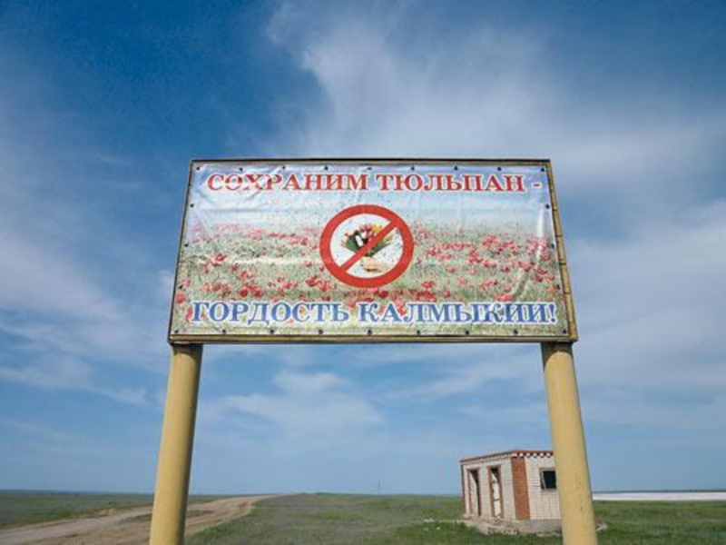 пальцам. Калмыкия – единственный регион в стране, где тюльпаны растут в естественных условиях на нетронутых цивилизацией территориях. В степи можно встретить три вида этого цветка. Самыми первыми расцветают белые тюльпаны – «подснежники». Чуть позднее появляются желтые и красные – тюльпаны Биберштейна и Шренка. Последний вид занесен в Красную книгу, но даже несмотря на охранный статус, площадь цветения красного тюльпана стремительно уменьшается.  Собирать степные тюльпаны нельзя – об этом должен помнить каждый пребывающий сюда. К тому же это еще и довольно бестолковое занятие: сорванные тюльпаны вянут и теряют свой вид в течение часа. В вазу букет не поставить, любимой не подарить, только выбросить там же в степи.