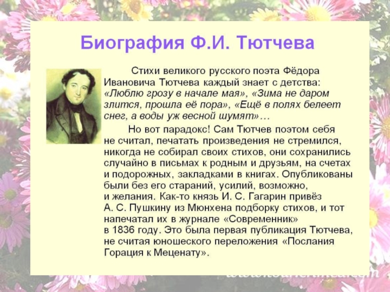 Презентация, доклад на тему Тютчев (чтение 1 класс)