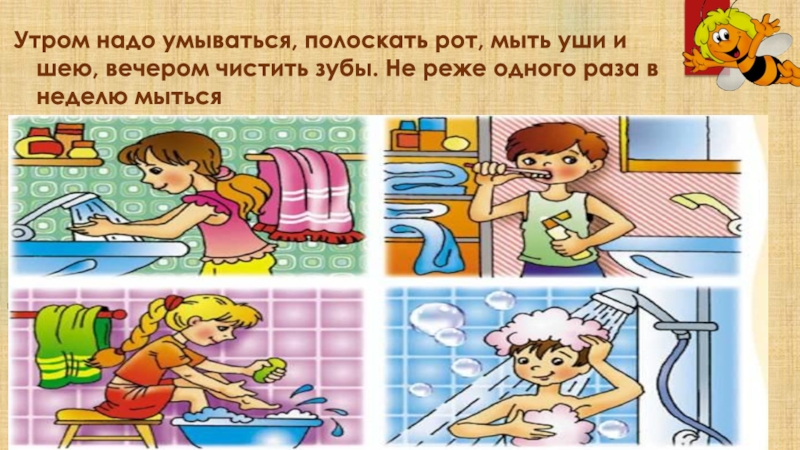Утром надо умываться, полоскать рот, мыть уши и шею, вечером чистить зубы. Не реже одного раза в