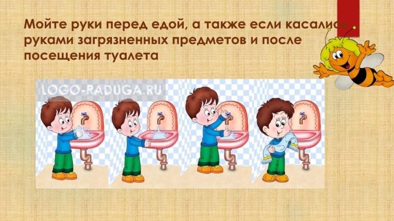Слайд 5Мойте руки перед едой, а также если касались руками загрязненных предметов