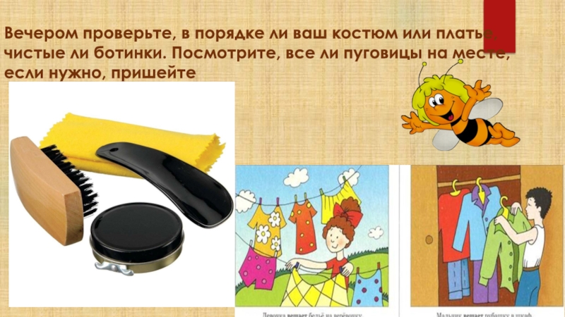 Слайд 8Вечером проверьте, в порядке ли ваш костюм или платье, чистые ли