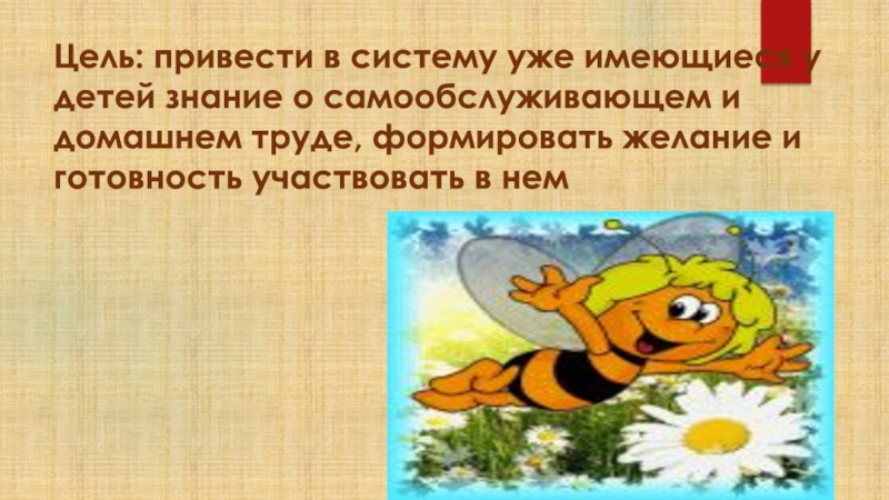 Слайд 2Цель: привести в систему уже имеющиеся у детей знание о самообслуживающем