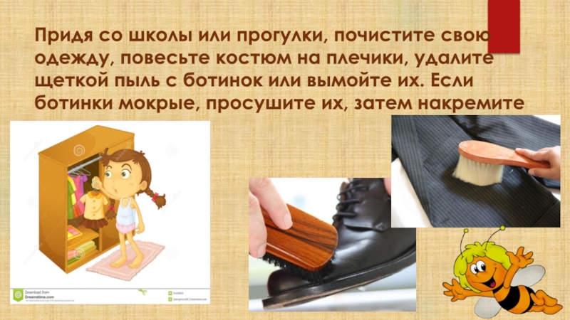 Слайд 9Придя со школы или прогулки, почистите свою одежду, повесьте костюм на