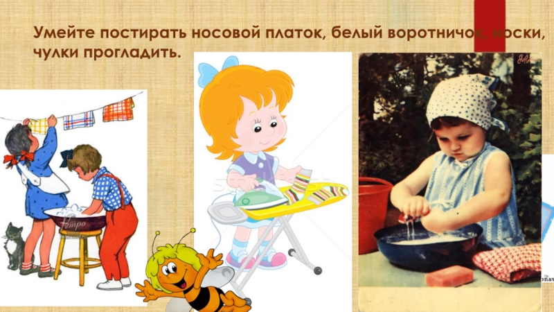 Умейте постирать носовой платок, белый воротничок, носки, чулки прогладить.