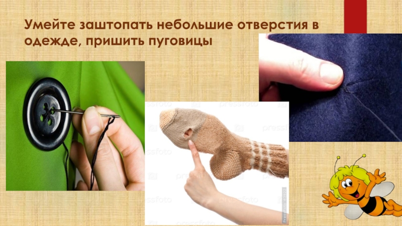 Слайд 11Умейте заштопать небольшие отверстия в одежде, пришить пуговицы
