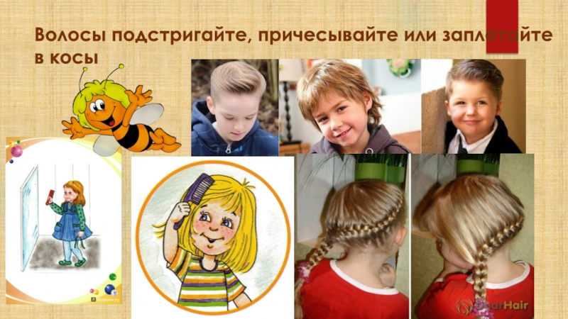 Слайд 7Волосы подстригайте, причесывайте или заплетайте в косы