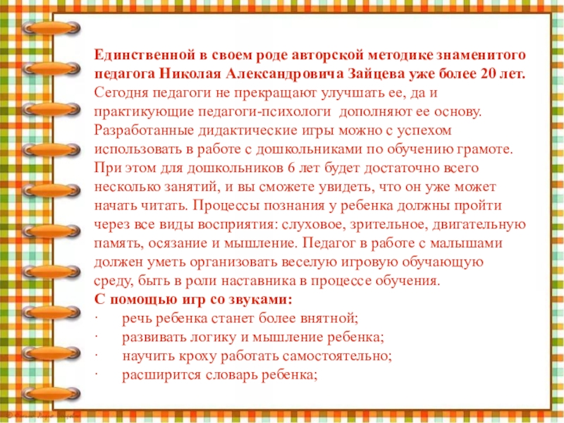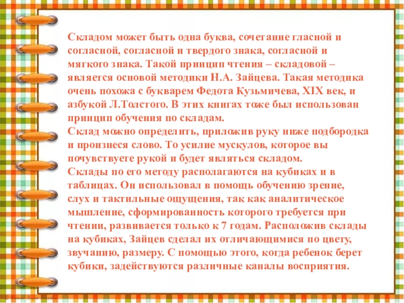 Складом может быть одна буква, сочетание гласной и согласной, согласной и твердого знака, согласной и мягкого знака. Такой принцип чтения – складовой – является основой методики Н.А. Зайцева. Такая методика очень похожа с букварем Федота Кузьмичева, XIX век, и азбукой Л.Толстого. В этих книгах тоже был использован принцип обучения по складам.