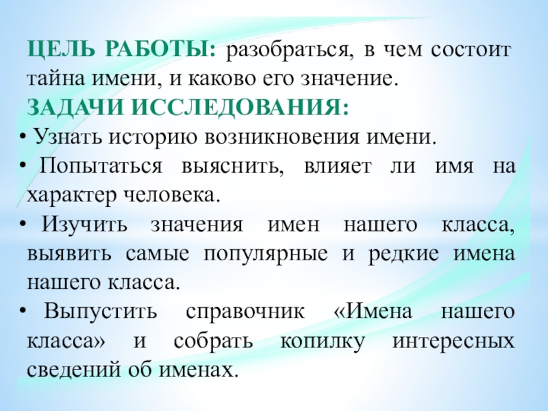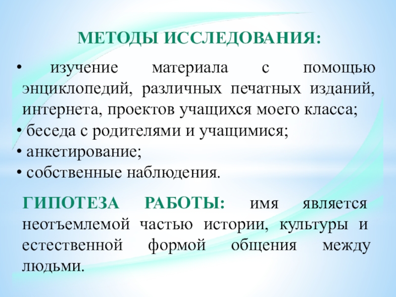 Гипотеза работы: имя является неотъемлемой частью истории, культуры и естественной формой общения между людьми.