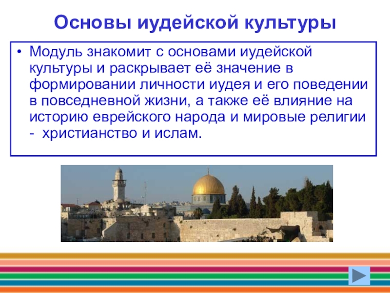 Модуль знакомит с основами иудейской культуры и раскрывает её
